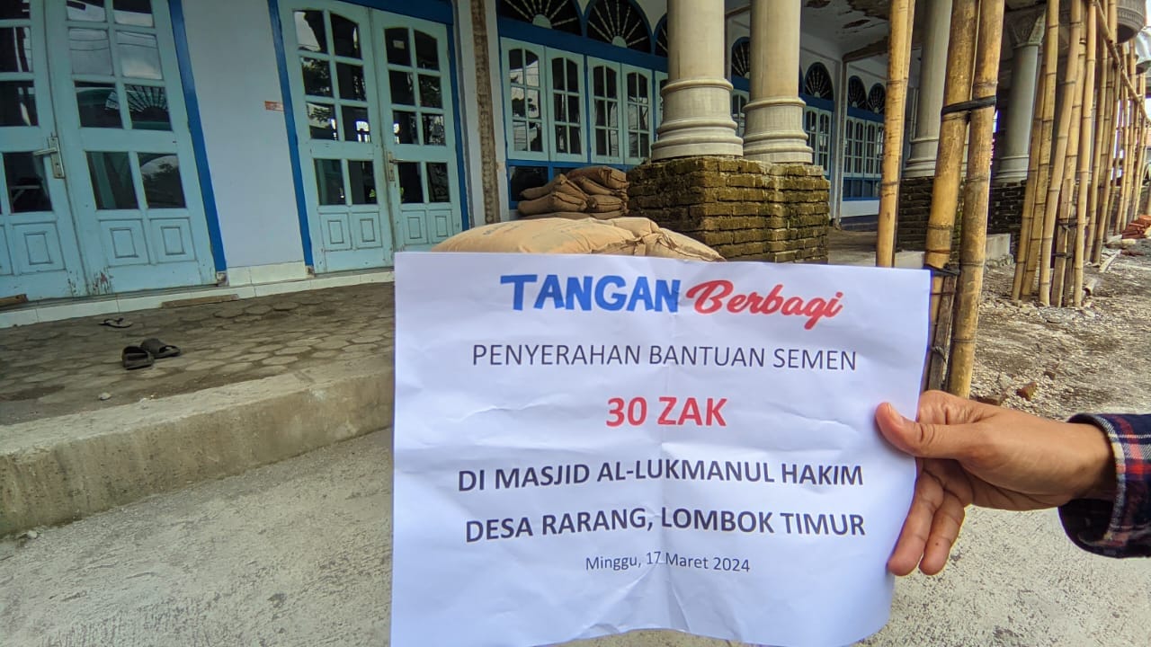 Lombok Timur, Alhamdulillah, Minggu (17/03/2024) telah disalurkan Bantuan berupa Semen sebanyak 30 zak di Masjid Al-Lukmanul Hakim, Desa Rarang Kecamatan Terara Kabupaten Lombok Timur.